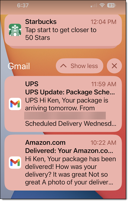 Notifications can be visual and audible. Visual notifications show up as banners with or without a preview of the content. The following image shows notifications from Starbucks and Gmail, each with a content preview.